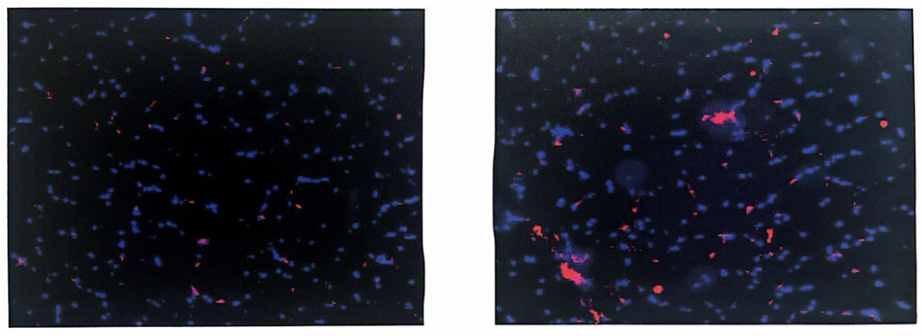Immunofluorescence images showing an increase in satellite cells by 30.2% in the pink (new muscle cells)