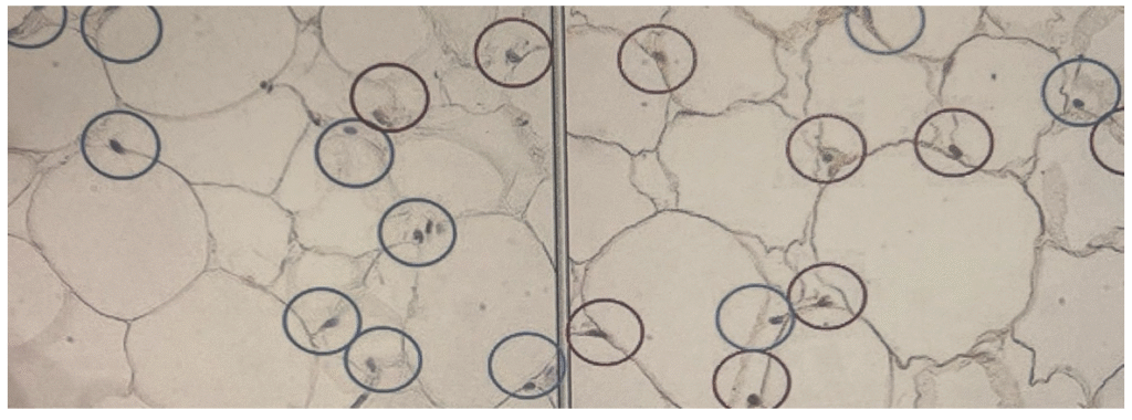 There was an increase in apoptotic levels (cell death) in fat cells from 18.75% baseline to 35.95% 8 hours post 1 treatment. The red circles show apoptotic nuclei and the blue circles show normal nuclei.