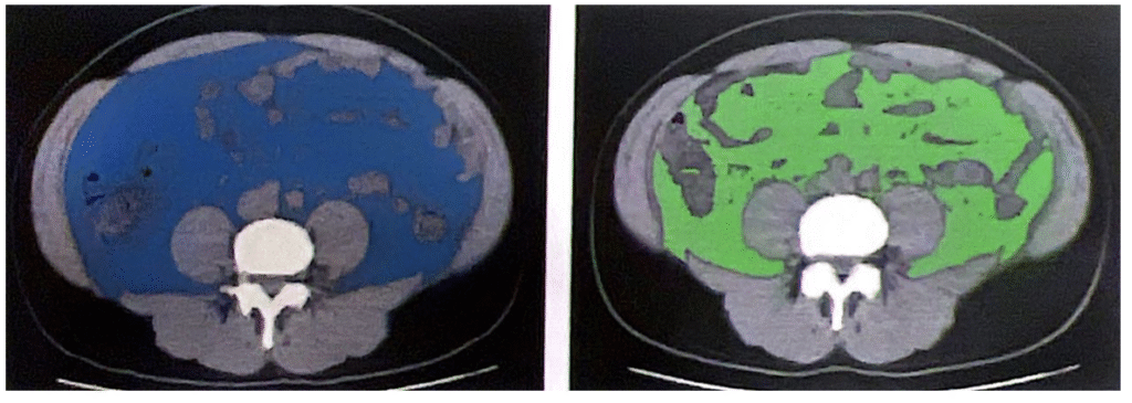 CT showing a decrease in subcutaneous fat and an increase in rectus abdominus muscle mass (SIX PACK)